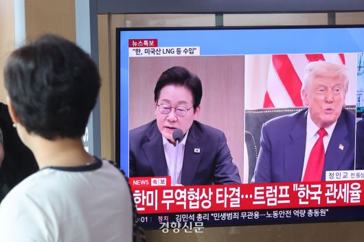 한국과 미국의 관세협상이 타결된 지난달 31일 서울역 대합실에서 시민들이 관련 뉴스를 시청하고 있다. 정지윤 선임기자 |