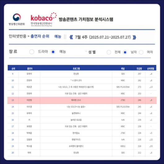 방송콘텐츠 가치정보 분석 시스템(RACOI)에 따르면, 2025년 7월 4주 차(7월 21일~27일) 인터넷 반응 분석 출연자 순위 남자 예능 순위에서 이찬원이 JTBC '톡파원 25시'로 13위를 기록했다.