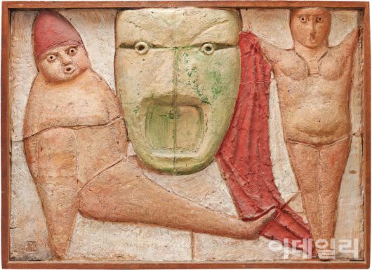 권진규의 ‘코메디’(1967). 제작에 앞서 스케치를 여러 점 남길 정도로 작가가 심혈을 기울인 부조 작품이다. 중앙의 가면과 양옆의 인물을 한 프레임에 잡아낸, 그리스로마시대 코미디 공연에서 따온 듯한 독특한 구상이 단박에 시선을 붙든다. 견고한 조형성을 바탕으로 동서양 문화를 접목했다. 뭔가에 놀란 듯 동그랗게 뜬 눈, 크게 벌린 입 모양, 진한 눈썹선 등은 한국 탈과 서양 가면을 섞어낸 형태다. 탈과 가면이 가진 ‘익명성’을 들여 사회로부터의 고립, 또 나아질 수 있다는 희망을 동시에 드러낸 작가의 의도가 읽힌다. 지난 6월 26일 국립현대미술관 과천에서 개막한 ‘MMCA 과천 상설전: 한국근현대미술Ⅱ’에 걸렸다. 테라코타에 채색, 71.5×97.5×9㎝. 국립현대미술관(이건희컬렉션) 소장. |