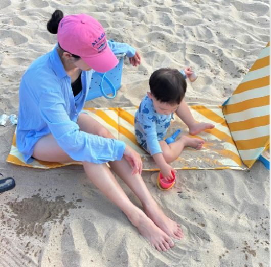 사진 속 윤승아는 핑크색 볼캡과 블루 셔츠 차림으로 아이와 모래놀이를 함께하며 여유로운 한때를 보냈고, 김무열은 상의를 탈의한 채 초록색 수영복 차림으로 아들과 함께 물놀이 용품을 옮기며 ‘등근육 육아’의 정석을 보여줬다.