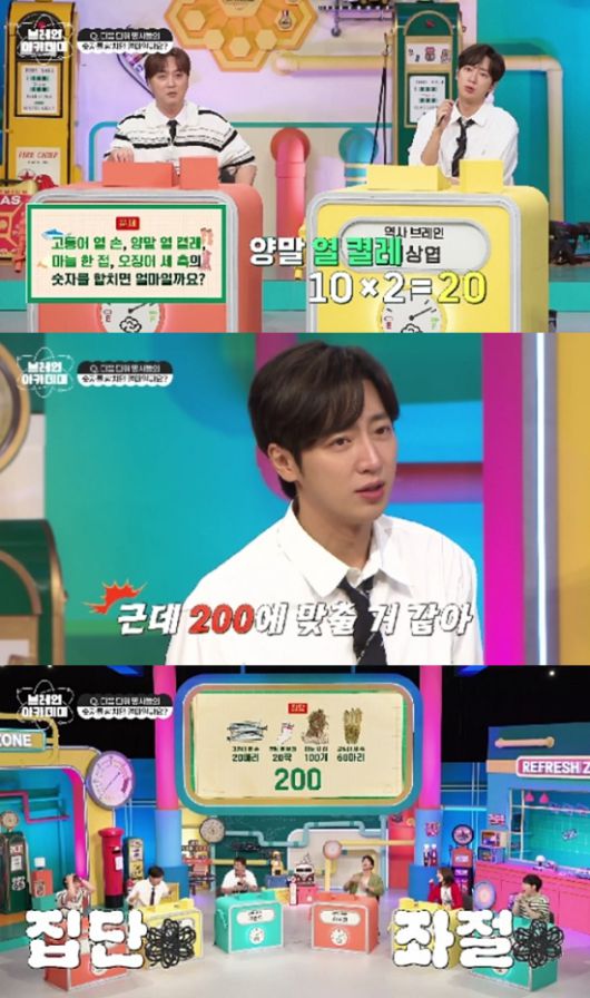 마지막으로 신영일은 ‘단위 명사’ 관련 퀴즈를 던졌다. ‘고등어 열 손, 양말 열 켤레, 마늘 한 접, 오징어 세 축의 숫자를 합치면?’이라는 문제를 냈는데, 하석진은 “시청자들은 이미 검색 끝났다”며 초조해했고, ‘오징어 한 축’ 사진을 본 이상엽은 “총 200일 것 같은데?”라고 추론했다.