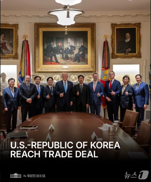 도너드 트럼프 미국 대통령이 지난 30일(현지시간) 워싱턴DC 백악관에서 구윤철 경제부총리 겸 기획재정부 장관 등 한국 정부 협상단과 무역합의를 타결한 후 기념촬영을 하고 있다. (백악관 X. 재판매 및 DB 금지) 2025.8.1/뉴스1 |