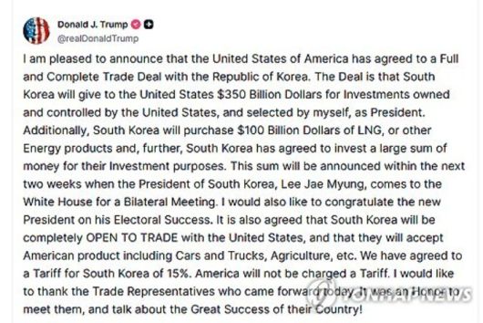 ◇ 손수호> 바로 어제 이 시간에 트럼프 대통령이 SNS에 글을 올렸는데요. 미국과 한국이 전면적이고 완전한 무역 합의를 체결했다. 관세 유예 시한을 하루 앞두고 전격 합의가 이루어진 건데요. 원래 그 후에 있을 2+2 회담 후에 대통령을 만날 걸로 봤는데 갑자기 연락을 받고 가서 만나서 타결까지 된 겁니다. 시한을 넘기는 거 아닌가 걱정했는데 일단 이렇게 무사히 타결은 됐고요. 하지만 중요한 건 그 내용이겠죠. 상호 관세는 25%에서 15%로 내려갔고 그 대신에 3,500억 달러 이게 우리 돈으로 490조 원이나 됩니다. 이런 대미 투자를 진행하기로 했습니다. 또 한편 소고기나 쌀 시장 추가 개방은 하지 않기로 했고요. 이번 협상 결과 어떻게 봐야 할지 한미 FTA 체결 당시에 기획단장으로 협상을 이끌었던 분입니다. 한국외대 이혜민 교수님 모시고 자세히 살펴보겠습니다. 교수님 안녕하십니까?