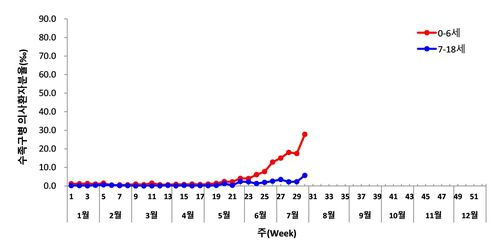 1일 질병관리청에 따르면 올해 30주차(7월 20∼26일) 전국 110개 표본감시 의료기관에서 보고된 수족구병 의심 환자는 진료환자 1천 명당 20.8명이었다.