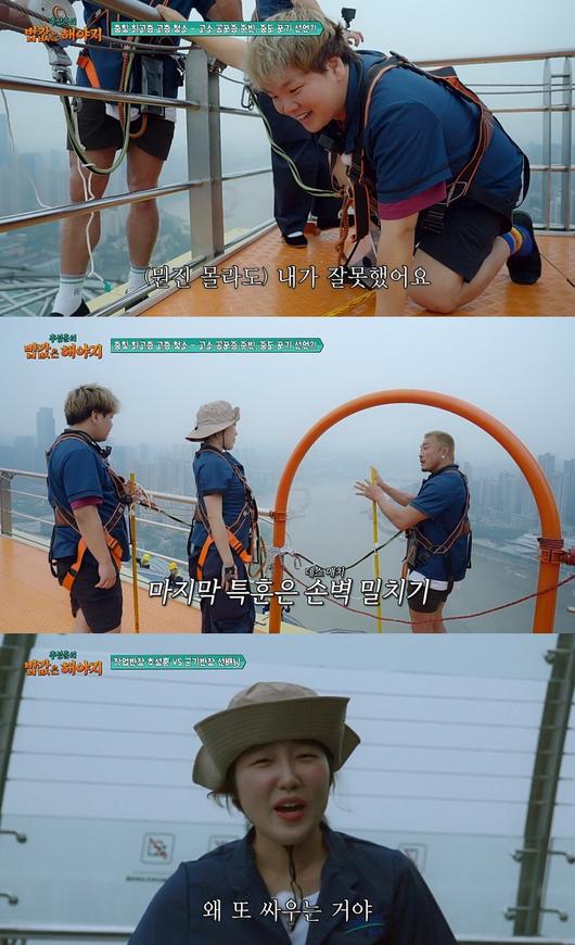이날 고소공포증이 있는 곽준빈은 아찔한 풍경이 내려다보이는 스카이 브리지 청소에 적응하지 못해 추성훈의 도움을 받는다.