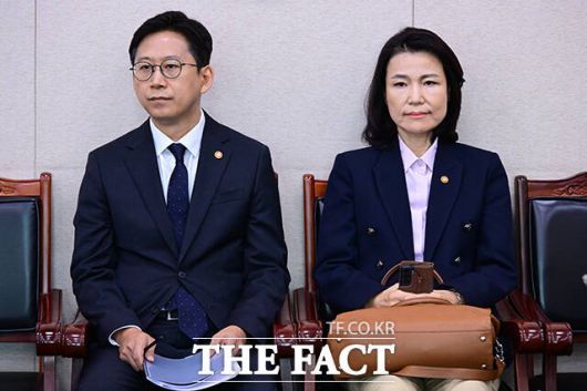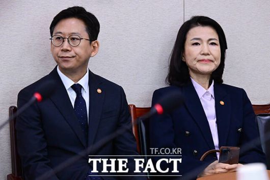 [더팩트ㅣ국회=남윤호 기자] 배경훈 과학기술정보통신부 장관과 이진숙 방송통신위원장이 1일 오전 서울 여의도 국회에서 열린 법제사법위원회 전체회의에 출석해 담당 부처 법안과 관련한 질의응답을 기다리고 있다.