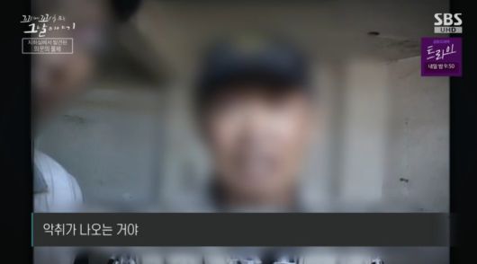 냄새가 고약해서 김 씨는 창고 앞에 선풍기를 갖다놓고 환기를 시켜가며 작업을 이어갔어. 근데 구멍이 점점 커질수록 냄새는 점점 심해져. 생전 처음 맡아보는 지독한 악취가 지하실을 가득 채웠어. 그리고 잠시 후, 시멘트 구조물 안에서 뭔가가 모습을 드러내. 안쪽에 두꺼운 비닐에 싸인 검은 물체가 보여. 일단 꺼내 보자며 두 사람이 비닐 한쪽을 잡고 힘껏 잡아당기는 순간, 투두둑! 비닐이 찢어져.