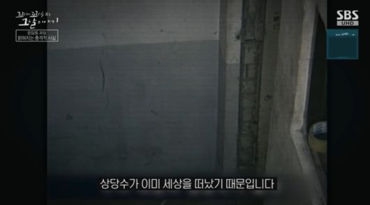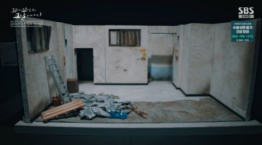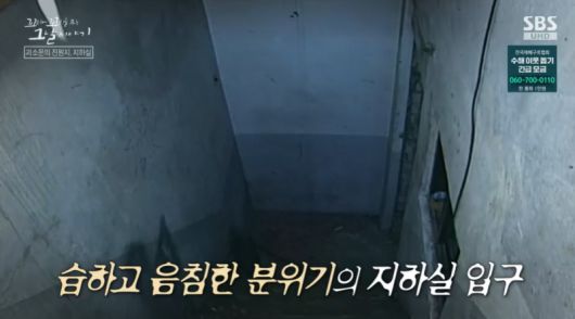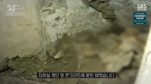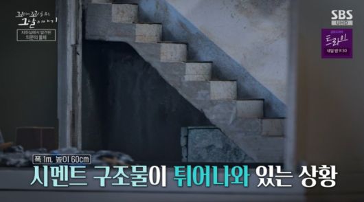 그 말을 들은 장 씨가 창고 안쪽을 살펴보니, 계단 밑 공간에 뭔가가 보여. 창고 안쪽에 시멘트로 만든 구조물이 있는 거야. 폭 1미터, 높이는 60센티미터 정도 되는 구조물이 툭 튀어나와 있어. 이 구조물 때문에 안 그래도 좁은 공간이 더 비좁아진 거지.
