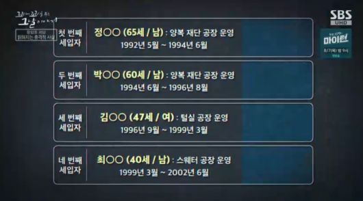 이제 남은 건 한 사람. 마지막 세입자 최 씨를 찾게 된 경찰은 충격적인 소식을 접하게 돼. 최 씨가 운영하던 스웨터 공장에는 총 9명의 직원이 있었거든. 그런데 2000년 직원 한 명이 갑자기 사망하는 일이 일어나. 교통사고를 당한 거야. 이 일은 시작에 불과했어. 이듬해인 2001년, 두 명의 직원이 차례로 사망한 것으로 밝혀져. 한 명은 간암, 다른 한 명은 폐암이었대. 급기야 2002년에는 또 다른 직원 한 명이 세상을 떠났다고 해. 사인은 당뇨병이었대. 9명의 직원 중 네 명이 사망했다는 소식을 듣게 된 거야.