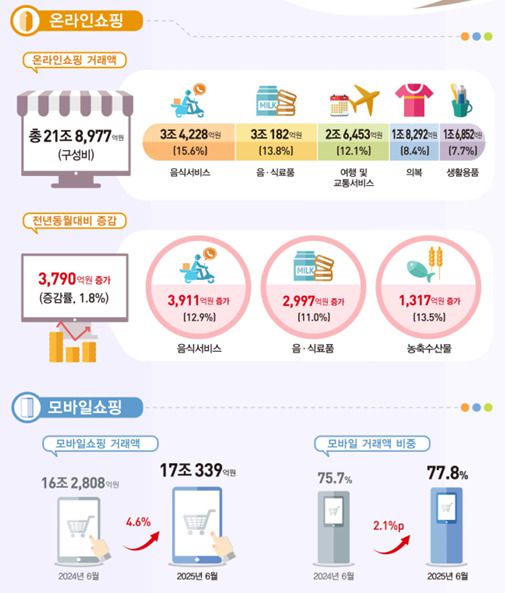 1일 통계청이 발표한 '2025년 6월 온라인쇼핑 동향'에 따르면, 지난달 온라인쇼핑 거래액은 21조8977억원으로 전년 동월 대비 3790억원(1.8%) 증가했다.