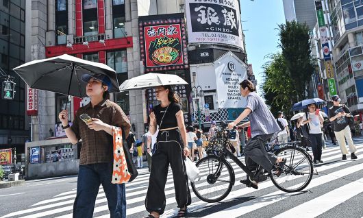 일본 도쿄의 중심가에서 행인들이 햇살을 피해 양산을 쓰고 걸어 다니고 있다. AFP연합뉴스 |