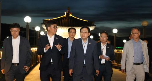 신임 최휘영 문화체육관광부 장관이 지난달 31일 취임 후 첫 일정으로 아시아태평양경제협력체(APEC) 정상회의’ 개최지인 경주를 찾아 야간 경관 조성 현장을 살펴보고 있다. [사진=문체부] |