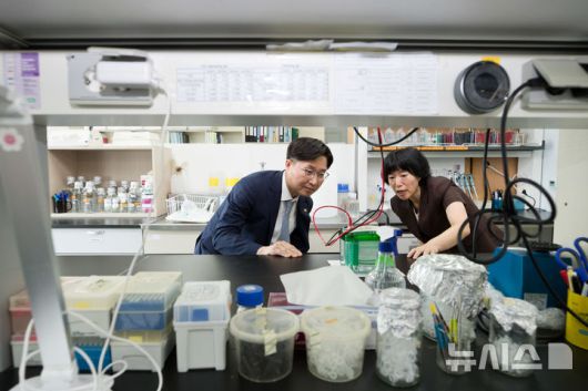 [서울=뉴시스]구혁채 과학기술정보통신부 제1차관이 1일 오전 서울 동대문구 경희대학교 박은정 교수 연구실을 방문해 박은정 교수로부터 주요실험장비 및 연구주제에 대해 설명 듣고 있다. (사진=과기정통부 제공) |