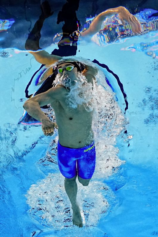 두 번째 주자인 이 대회 남자 자유형 400m 동메달리스트 김우민도 힘차게 물살을 갈랐다. 300~350m 구간에서 스퍼트를 냈고, 2위를 유지한 상황에서 세 번째 주자 이호준에게 배턴을 넘겨줬다. 1분46초09의 기록을 남겼다.