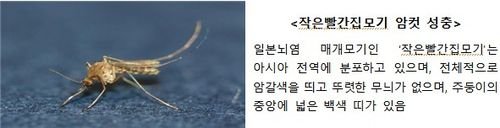 질병청에 따르면 일본뇌염 매개모기 감시체계 운영 결과, 지난달 30일 전남 완도군에서 작은빨간집모기가 전체 모기의 60.1%로 확인돼 경보 발령 요건에 해당했다.