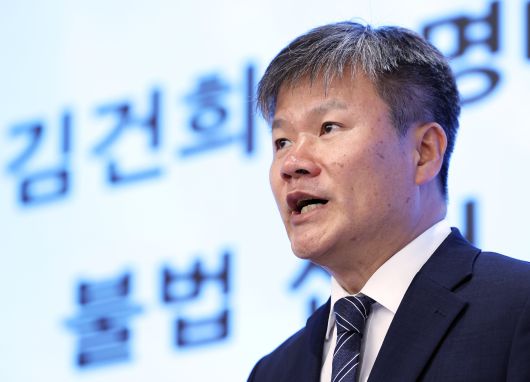 윤석열 전 대통령 부인 김건희 여사와 관련한 각종 의혹 사건을 수사하는 민중기 특별검사팀 문홍주 특검보가 지난 9일 오후 서울 종로구 KT광화문빌딩에서 정례 브리핑을 하고 있다. /뉴스1 |