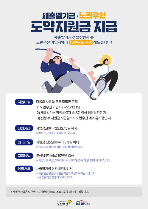 협약에 따라 양 기관은 새출발기금 성실상환자가 노란우산에 가입한 경우 도약지원금을 지급하는 '새출발기금-노란우산 도약지원금 지원사업'을 실시한다.
