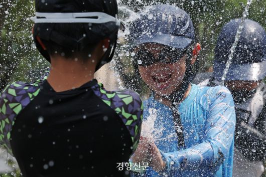 서울 광화문 광장을 찾은 어린이들이 물놀이하며 더위를 식히고 있다. 정효진 기자