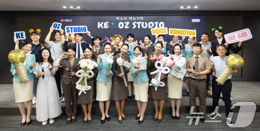 (서울=뉴스1) 이연주 기자 = 대한항공이 아시아나항공과 함께 지난달 30일 서울 강서구 본사에서 양사 임직원이 직접 참여하는 목소리 기부 행사 'KE-OZ STUDIO'를 열었다고 1일 밝혔다. 목소리 기부 행사 'KE-OZ STUDIO'에 참여한 대한항공과 아시아나항공 양사 임직원들이 기념 촬영을 하고 있다. (대한항공 제공. 재판매 및 DB 금지) 2025.8.1/뉴스1
