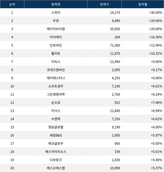 이어 상승률 2위 우양(103840)은 주가가 29.96% 폭등하며 종가 4,490원에 상승 마감했다. 상승률 3위 에이치브이엠(295310)의 주가는 35,850원으로 29.89% 폭등하며 강세를 보였다. 상승률 4위 아이에이(038880)는 16.30% 급등하며 264원에 마감했다. 상승률 5위 인포바인(115310)은 12.46%의 급등세를 타고 종가 71,300원에 마감했다.