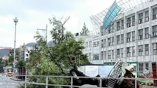 광주 동구 옛 전남도청 앞 회화나무가 태풍 피해를 입고 쓰러져 있다. 연합뉴스 |