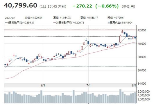 이날 닛케이225평균주가지수는 전일 종가보다 0.66%(270.22엔) 하락한 4만799.60엔에 거래를 마쳤다. 도쿄증권거래소주가지수(TOPIX, 토픽스)는 사흘째 상승하며 0.19%(5.58포인트) 오른 2948.65포인트로 마감했다.