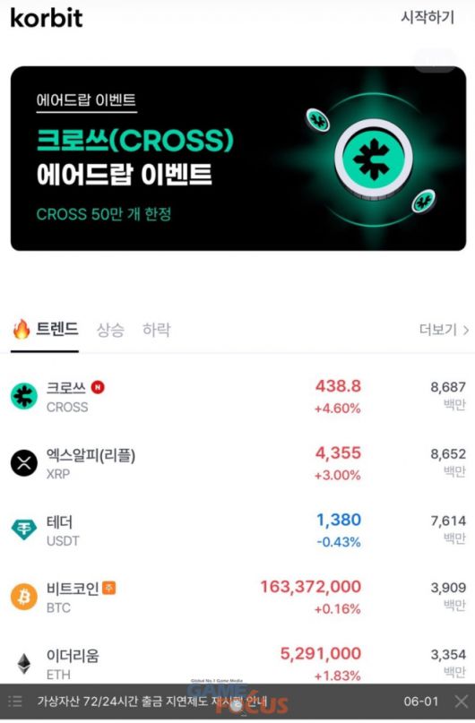 한편 크로쓰는 코빗 상장 후 국내 가상화폐 홀더들의 큰 관심을 받으며 주요 가상화폐들을 제치고 거래량 1위에 올랐으며, 코빗에서 이를 기념해 크로쓰 에어드랍 이벤트를 진행해 눈길을 끌었다.