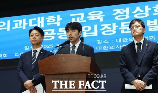 이선우 대한의과대학-의학전문대학원학생회 비상대책위원장(가운데)이 지난달12일 오후 서울 용산구 대한의사협회에서 의과대학 교육 정상화를 위한 공동 성명서를 발표하고 있다./뉴시스 |