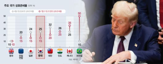 도널드 트럼프 미국 대통령이 한국에 대한 상호관세율을 15%로 책정하는 등 전 세계 69개 경제주체에 대한 관세율을 담은 행정명령에 서명했다. 대만은 32%에서 20%로 낮아졌고 브릭스(BRICS) 국가들은 최대 50%의 높은 관세율을 부과받았다. 이를 두고 백악관은 효율성을 추구하던 글로벌 무역 체계가 핵심 산업을 보호하는 쪽으로 전환됐다고 평가했다.
