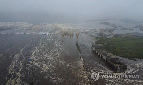 31일 오전 촬영된 사진에서 부두의 일부분이 꺾여 원위치에서 벗어난 모습으로, 이 부분이 선박 계류장에서 떨어져 나갔을 가능성을 보여준다.