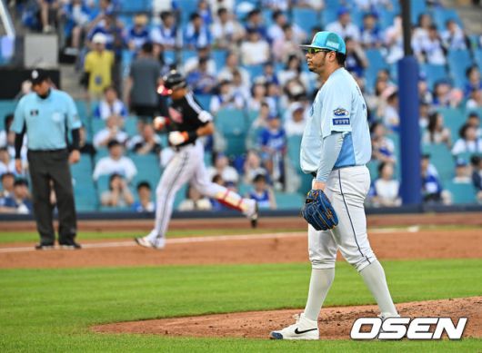 삼성 라이온즈 후라도가 3회초 1사 LG 트윈스 천성호에게 우월 솔로 홈런을 맞고 아쉬워하고 있다. 2025.08.01 / foto0307@osen.co.kr