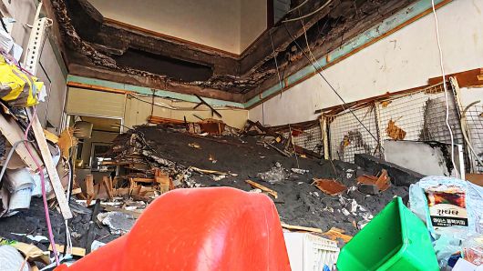 2층 건물 1층 천장이 통째로 내려앉은 실내는 처참합니다.