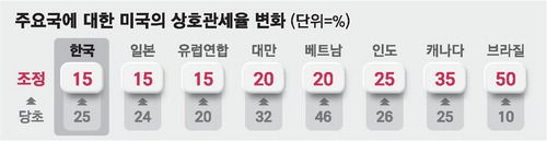 미국과 협상을 타결하지 못한 인도와 대만에 각각 25%, 20%의 상호관세율이 매겨졌다. 한국, 일본, 유럽연합(EU)에 대한 미국의 상호관세율은 15%로 확정됐다.