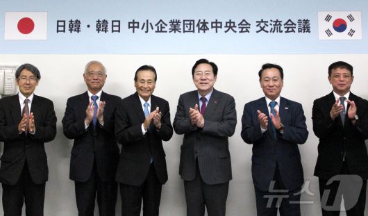 (서울=뉴스1) 김진환 기자 = 김기문 중소기업중앙회장(오른쪽 세 번째)이 1일 일본 도쿄 전국중소기업단체중앙회를 방문해 모리 히로시 일본 전국중소기업단체중앙회장(왼쪽 세 번째)을 비롯한 참석자들과 기념 촬영을 하고 있다. (중소기업중앙회 제공, 재판매 및 DB 금지) 2025.8.1/뉴스1