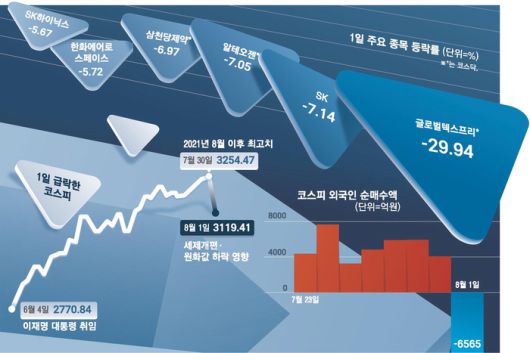 새 정부 출범 이후 고공행진하던 한국 증시가 ‘나 홀로’ 급락했다. 코스피는 증시 부양 정책에 대한 기대감에 힘입어 이재명 대통령 취임일인 6월 4일 2770.84에서 7월 30일 3254.47까지 상승했으나 이달 1일 전날 대비 126.03포인트 하락하며 한 달 전 종가 수준으로 되돌아갔다.