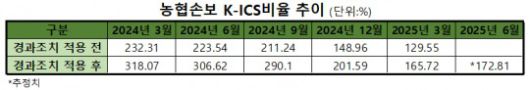 1일 보험업계에 따르면, 올해 1분기 말 기준 농협손해보험의 경과조치를 적용한 K-ICS비율은 165.72%로 나타났다. 이는 전년 동기 대비 152.35%p 크게 감소한 수준이다.