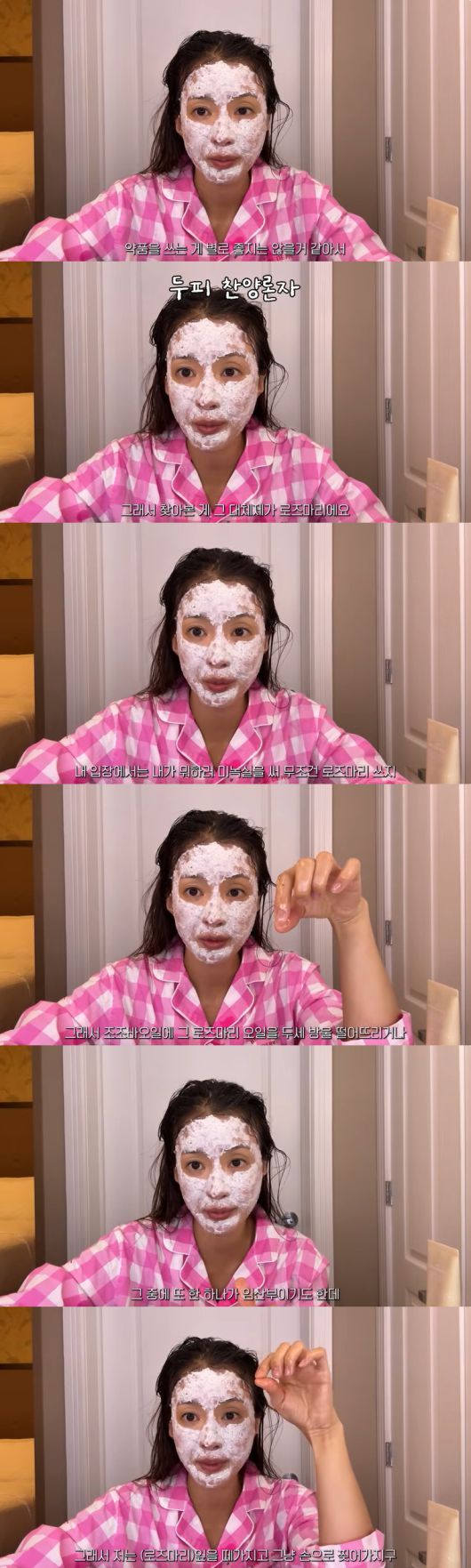 그는 "로즈마리 오일을 쓸 수 없는 몇 명의 군이 있지 않냐. 그중 하나가 임산부이기도 하다. 워낙 고농축이니까 임산부는 의사 선생님이랑 상의하라고 하는데, 저는 (로즈마리) 잎을 떼서 손으로 찢어서 오일에 섞어서 그냥 바른다. 그거는 또 괜찮다더라"며 오일 대신 잎을 사용한다고 전했다.