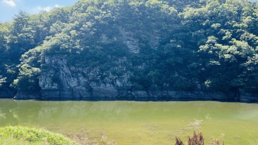 1일 천전리 명문과 암각화에는 56m까지 물이 차올라 있었다. 암각화 전망대로 가는 길에는 물 비린내가 진동했다. 물은 녹조로 가득했다.