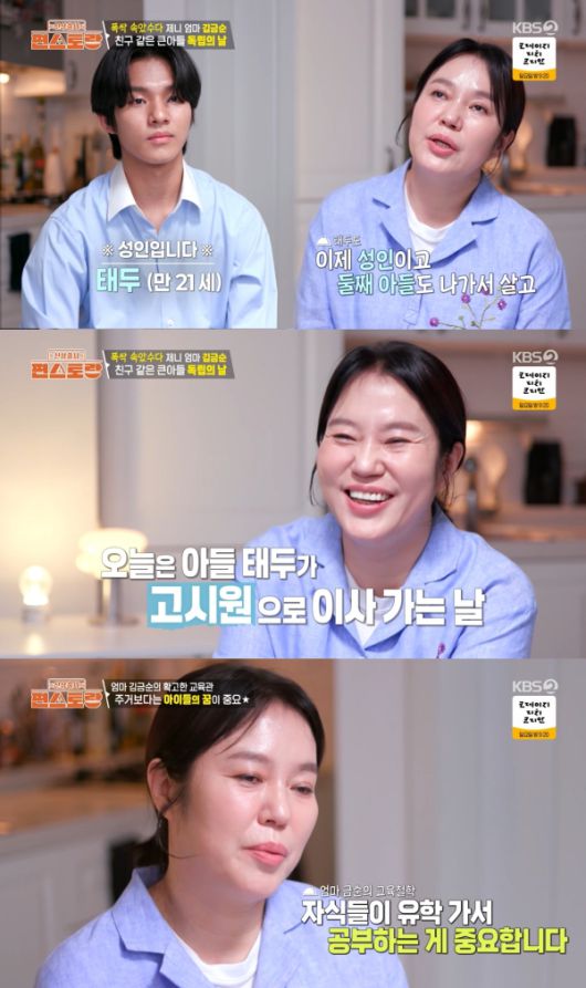 김금순은 "반지하 원룸에 살아도, 보증금을 다 빼고 단기 임대 주택에 살아도 자식들이 유학 가서 공부하는 게 중요하다. 여행을 가서 경험하는 게 중요하다. 자기가 원하는 삶을 살았으면 좋겠다"며 자신의 교육철학을 공개했다.