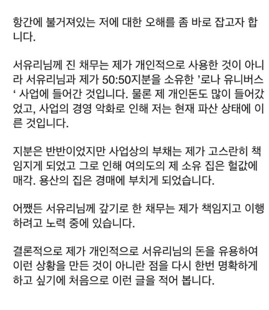 서유리님께 진 채무는 제가 개인적으로 사용한 것이 아니라 서유리님과 제가 50:50 지분을 소유한 '로나 유니버스' 사업에 들어간 것입니다. 물론 제 개인돈도 많이 들어갔었고, 사업의 경영 악화로 인해 저는 현재 파산 상태에 이른 것입니다.