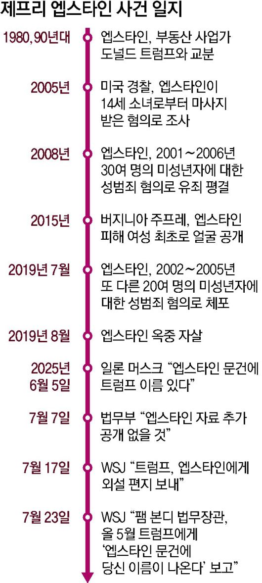 트럼프 대통령과 엡스타인의 연관성을 적극 보도하는 매체가 WSJ라는 점도 눈길을 끈다. WSJ는 지난달 17일 트럼프 대통령이 두 사람이 아직 돈독한 관계였던 2003년 엡스타인의 50세 생일 때 여성 나체 그림을 배경으로 한 축하 편지를 그에게 보냈다고 보도했다. 6일 후에는 팸 본디 법무장관이 올 5월 대통령에게 “엡스타인 문건에 당신의 이름이 여러 번 나온다”는 점을 보고했다는 추가 보도도 냈다.