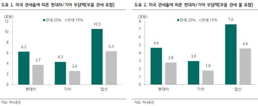2일 KB증권에 따르면 한미 무역협상 타결로 현대차는 2조 원, 기아는 1조7000억 원의 관세비용 부담이 경감될 것으로 예상됐다. 하나증권은 관세율 15% 적용 시 현대차·기아의 총 관세 부담액이 기존 10조5000억 원에서 6조3000억 원으로, 4조2000억 원가량 감소할 것으로 분석했다.