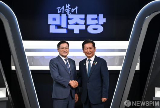 [서울=뉴스핌] 국회사진기자단 = 박찬대, 정청래 더불어민주당 당대표 후보가 27일 오후 서울 여의도 KBS 신관 공개홀에서 열린 TV토론회에 앞서 악수를 하며 기념촬영을 하고 있다. 2025.07.27 photo@newspim.com |