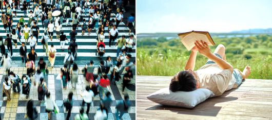 쉴 틈 없이 날아드는 자본의 요구에 종종걸음치며 살아가는 현대인들은 휴가를 기다리며 노동의 시간을 버텨낸다. 하지만 막상 휴가가 주어지면 어떻게 쉬어야 나와 연결되는 깊은 휴식 체험을 할 수 있는지 잘 모르는 경우가 많다. 사진은 바쁜 발걸음으로 하루를 살아가는 도시인의 모습과 책을 읽으며 여유롭게 휴식을 즐기는 모습. 게티이미지뱅크 |