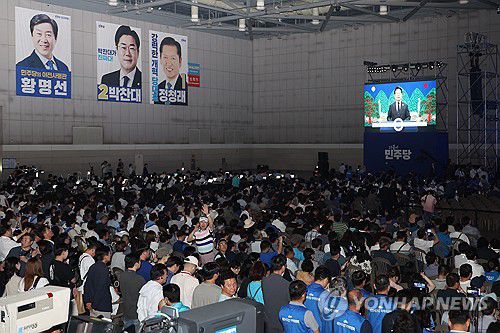 (고양=연합뉴스) 김주성 기자 = 2일 고양 킨텍스에서 열린 더불어민주당 전국당원대회 개회식에서 이재명 대통령의 영상 축사가 상영되고 있다. 2025.8.2