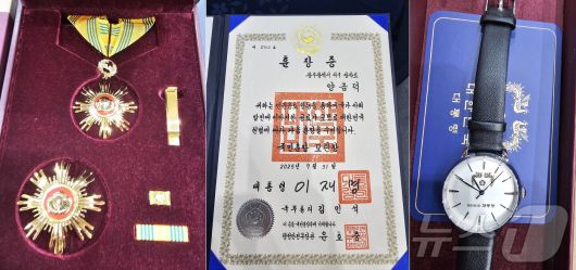 2일 광주 동구 세종요양병원에서 일제 강제동원 피해자 양금덕 할머니(96)가 국민훈장 모란장을 수여받았다. 사진은 양금덕 할머니가 수여받은 국민훈장 모란장 훈장증과 훈장 세트, 대통령 기념 시계. 양 할머니는 윤석열 정부 시절인 2022년 강제동원 피해자 권리 회복에 힘쓴 공로로 훈장 수여가 추진됐으나 외교부가 제동을 걸면서 무산됐으나 이재명 대통령이 윤 정부 시절 훈장 수여를 거부한 이들에 대한 전수 조사를 지시하면서 이날 훈장이 수여됐다. 2025.8.2/뉴스1 ⓒ News1 서충섭 기자 |