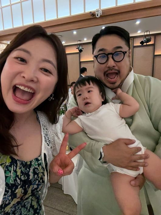 공개된 사진 속에는 강재준, 이은형 부부의 아들 현조의 돌잔치에 참석한 심진화가 강재준을 비롯해 동료들과 사진을 찍고 있는 모습이 담겼다.