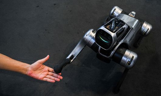 방문객들이 사족보행 로봇을 체험해 보는 모습. 상하이=신화연합뉴스(AFP연합뉴스) |