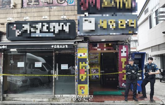 경찰이 31일 서울 구로구의 여성 살해 사건이 발생한 건물 앞에 폴리스라인을 치고 출입을 통제하고 있다. 김태욱 기자 |