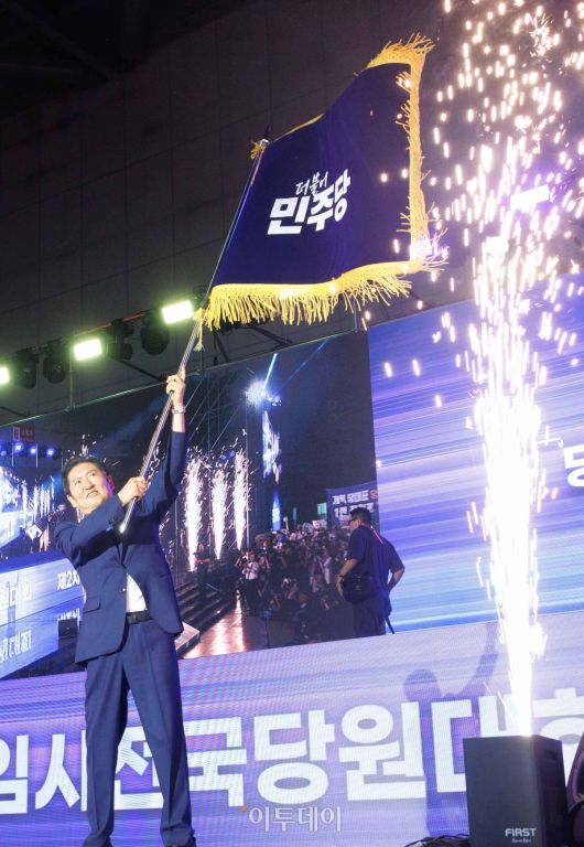 정청래 더불어민주당 신임 대표가 2일 경기 고양시 킨텍스에서 열린 제2차 임시전국당원대회에서 당대표로 선출된 뒤 당기를 흔들고 있다. |